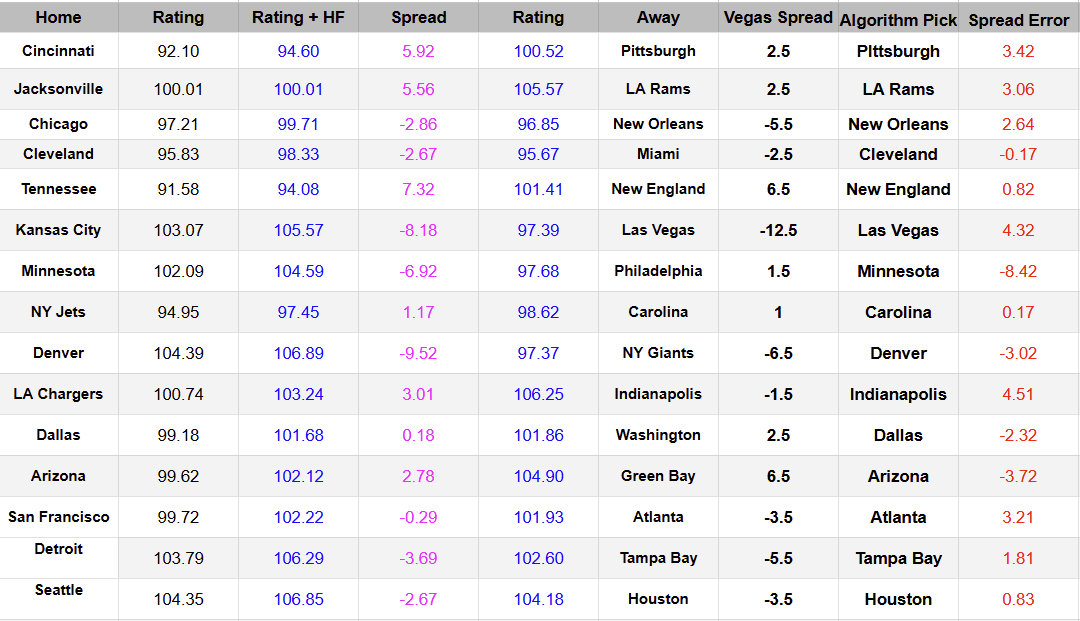 There has been only one 7+ point line error this season, and that was last week when the Giants beat the Eagles. So the Algorithm is putting it’s perfect 1 – 0 record on line by doubling down against the Birds in back to back weeks.