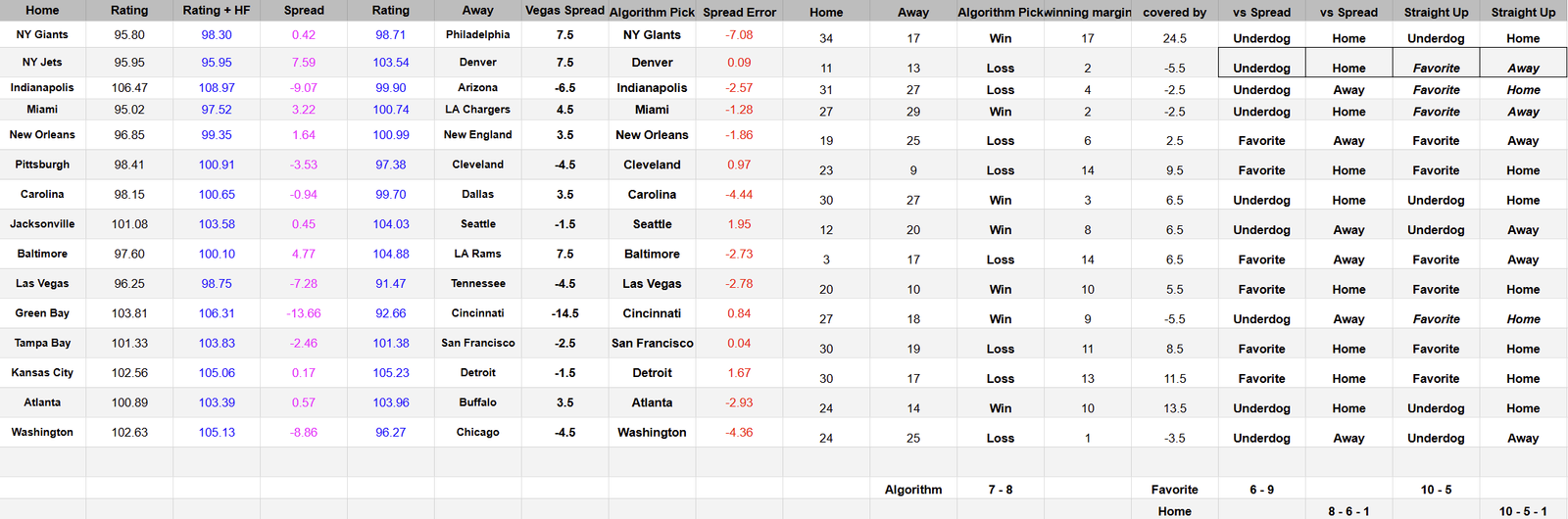 The Algorithm is not impressed with the Eagles in 2025, and the G-men added emphasis to that opinion with a 34 – 17 victory over Philadelphia. The Algorithm had this game as a pick’em or perhaps Philadelphia giving 0.5 point to the Giants, yet Vegas had the Birds favored by over a touchdown.